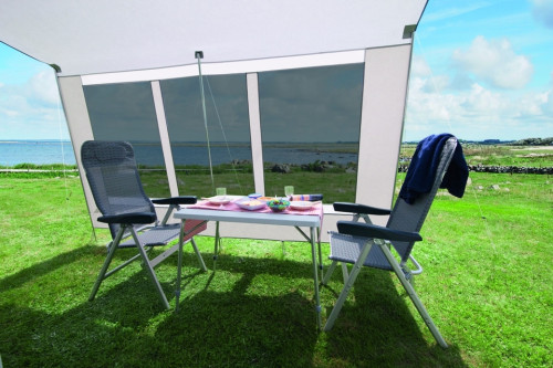 Materiál: Střecha a přední stěna z polyesterové tkaniny potažené jednostranně, omyvatelná a velmi snadná na údržbu, velmi průhledná okenní fólie na přední stěně je tónovaná do šeda a pohlcuje minimálně 90 % nezdravého UV záření.