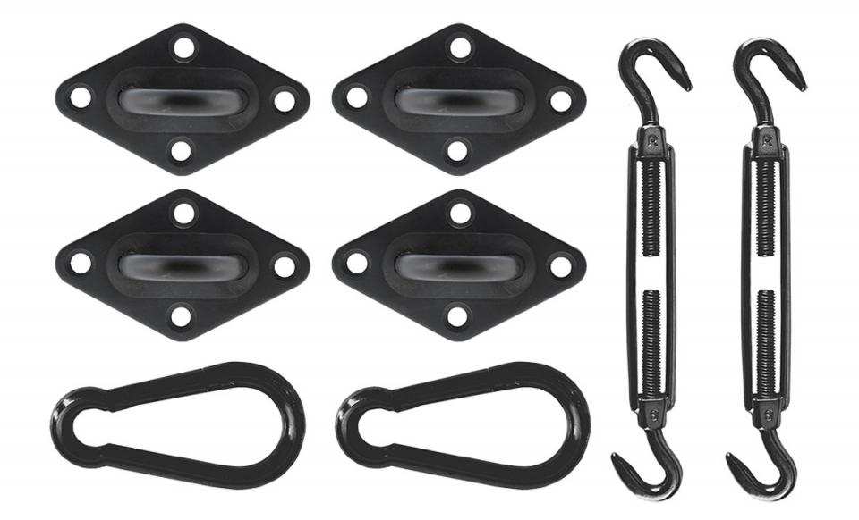 Abyste se mohli ze své sluneční clony těšit co nejdéle je důležité abyste ji správně připevnili. S touto šikovnou montážní sadou ji můžete nainstalovat během okamžiku. Montážní sada obsahuje jednu nebo dvě karabiny, dva klíče a tři nebo čtyři montážní desky s oky.