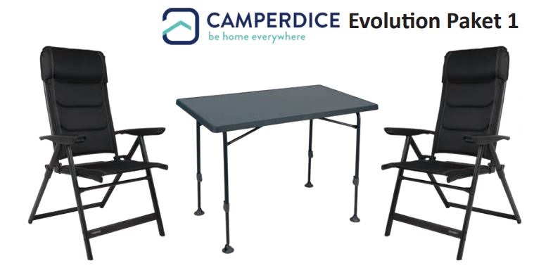 Sada se skládá z 2 x křesla CAMPERDICE Evolution v černé barvě (č. KH-20-880) a 1 x stolu CAMPERDICE Evolution 100 (č. KH-21-198)
