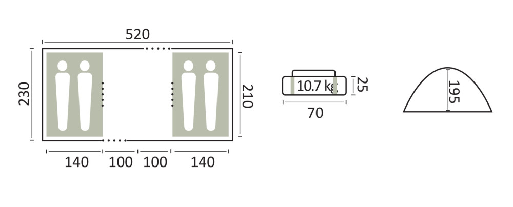 Prostorný rodinný kupolový stan s dostatkem prostoru pro lepší spaní. Má velké a účinné větrací otvory. Obsahuje tašku na přenášení.