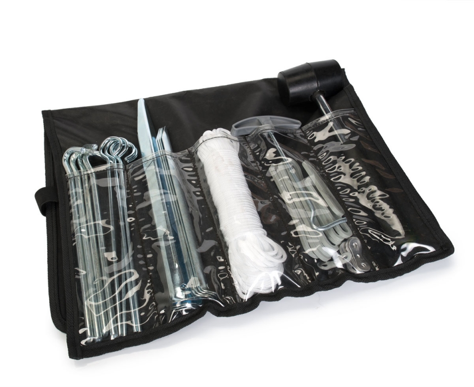 34dílná sada příslušenství ke stanu, ideální pro připevnění stanu k různým povrchům. Obsahuje kolíky na tvrdou a měkkou zem, stanové bungee šňůry a 20 m stanové šňůry. Včetně praktické přenosné tašky.