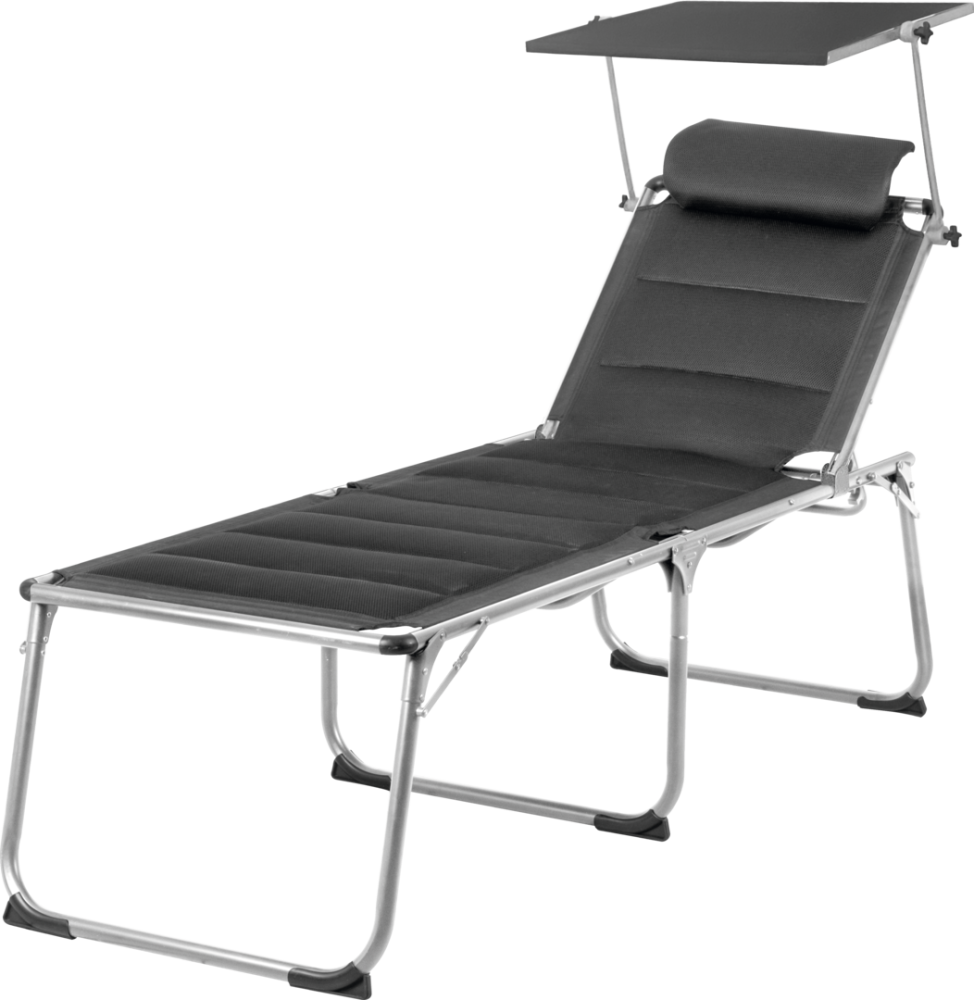 Lehátko se sluneční clonou, vysokou lehací plochou a výškově nastavitelnou opěrkou hlavy. Skládací hliníkový rám, potah z 3Durafeel (100% polyester). Nosnost 120 kg.