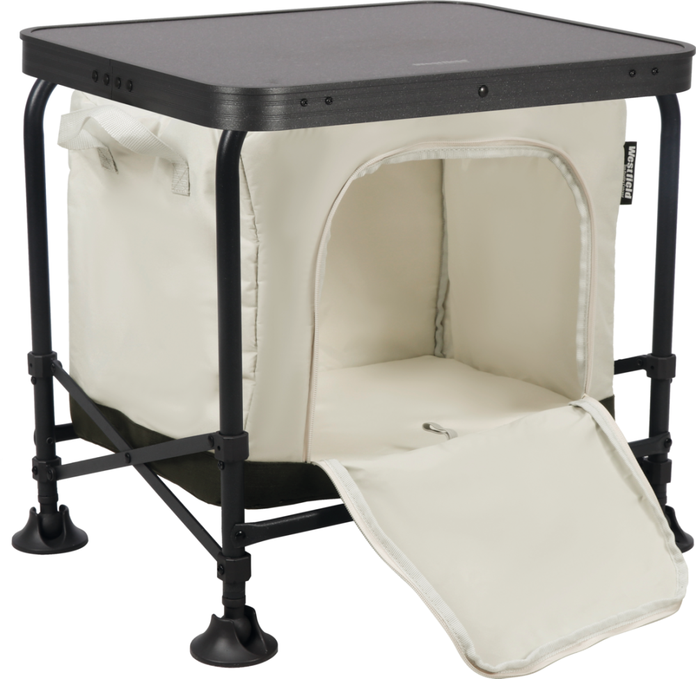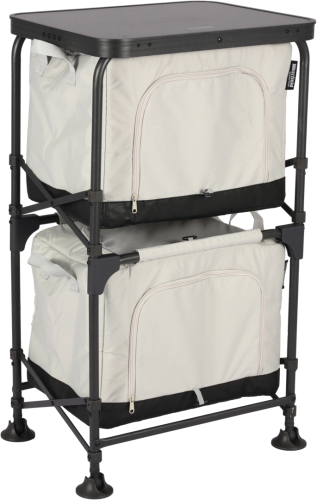 MODULOR I a II jsou chytré řešení kempingových skříní s malou velikostí balení, které vám umožní naplnit obsah doma pomocí odnímatelného úložného boxu. V kempu se MODUL jednoduše otevře a box se snadno připevní dovnitř. MODULOR I obsahuje úložný box, který lze plnit shora i ze strany, a připevnitelnou desku stolu. Pokud potřebujete více úložného prostoru, sejměte desku stolu a položte MODULOR II na MODULOR I a kempingová skříň se rozšíří. Obsah do max. 12 kg.