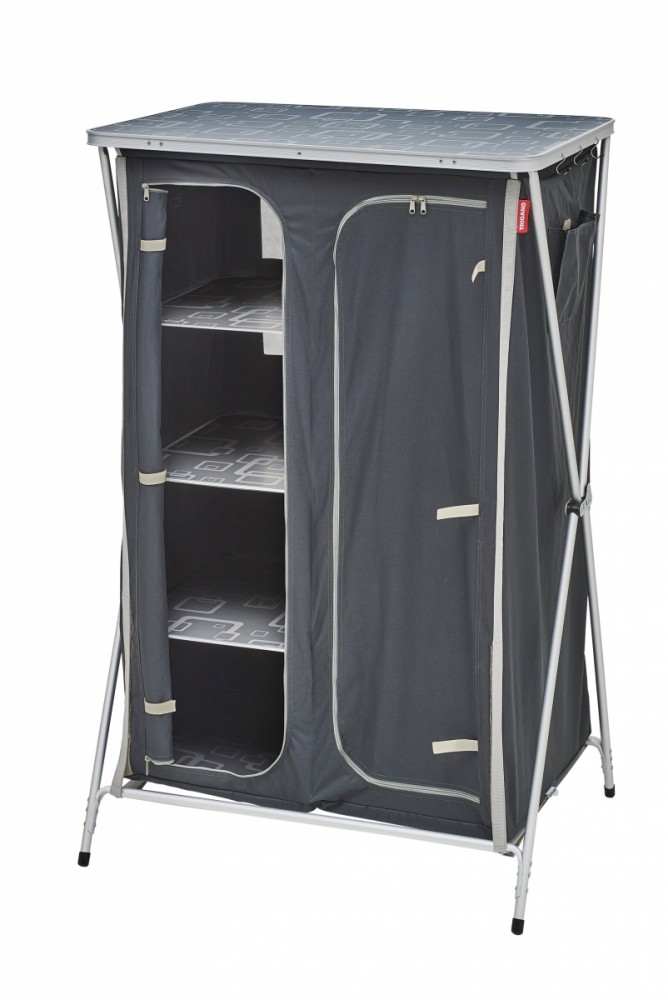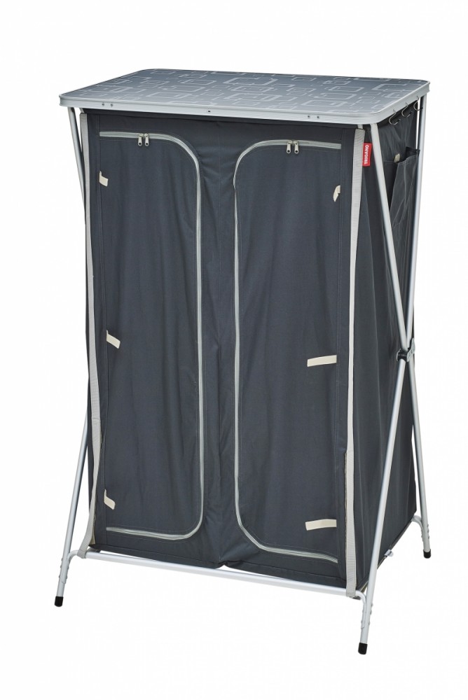 Potah z 500D polyesteru potaženého PVC (100% polyester), hliníkový rám ø19mm. Čtyři vzorované police, jedna velká přihrádka, odnímatelná pracovní deska, zadní větrání. Obsahuje tašku na přenášení. Rozměry 90x67x140 cm. Rozměr balení 90 x 80 x 11 cm. Hmotnost 10,6 kg.