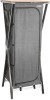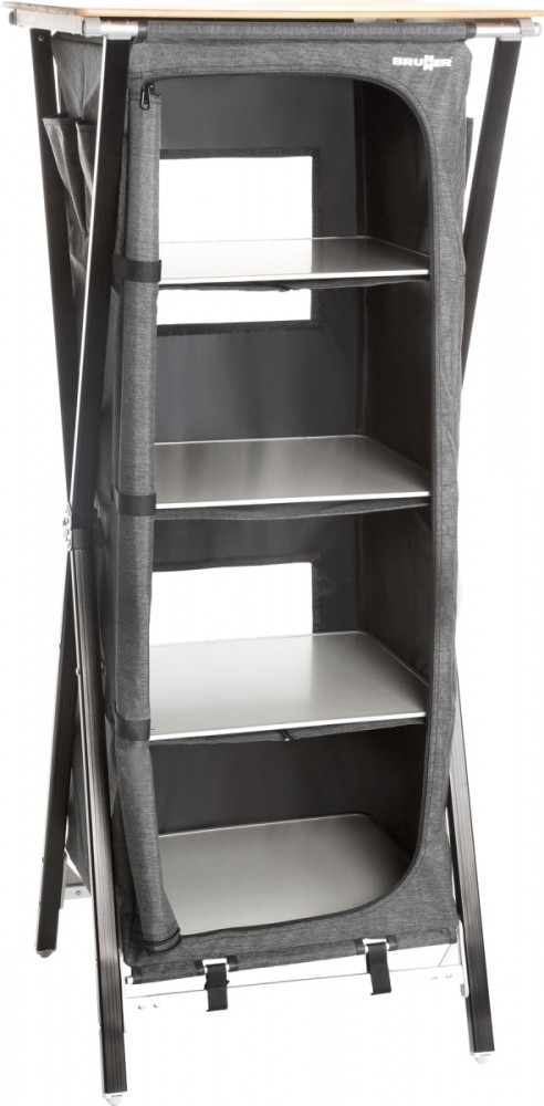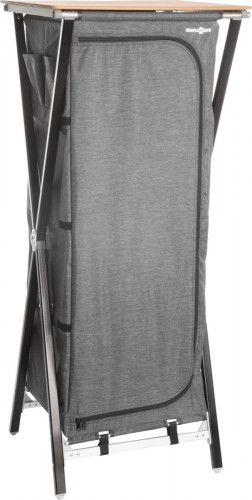 Pevná víceúčelová skříň s CROSS rámem z obdélníkového hliníkového profilu a středovým kovovým kloubem. Všechny nohy jsou výškově nastavitelné. Se 4 vnitřními policemi a horní bambusovou pracovní deskou. Potah 100% polyester. Bezmontážní systém. Obsahuje tašku na přenášení.