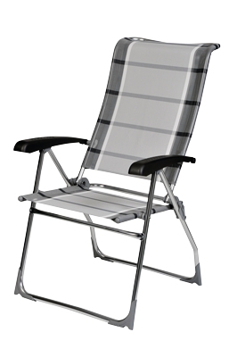 Levný základní model. Lehká hliníková skládací židle s extra vysokým opěradlem. Toto je 8x nastavitelné. Křeslo je ideálním společníkem při kempování. Rám vyrobený z robustní kulaté hliníkové trubky pro dobrou stabilitu. Rozměry: sedák 49 x 43 cm, výška sedáku 45 cm, výška opěradla 78 cm. Složený rozměr 106 x 60 x 10 cm. Nosnost do 100 kg. Materiál potahu: 70% polyvinylchlorid, 30% polyester. Hmotnost pouze cca 2,8 kg. Barva šedá/bílá.
