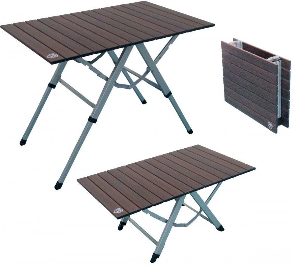 Rychle skládací stůl, s hliníkovou deskou stolu v dekoru dřeva, nastavitelná výška od 35 cm do 60 cm. Součástí je praktická taška na přenášení.