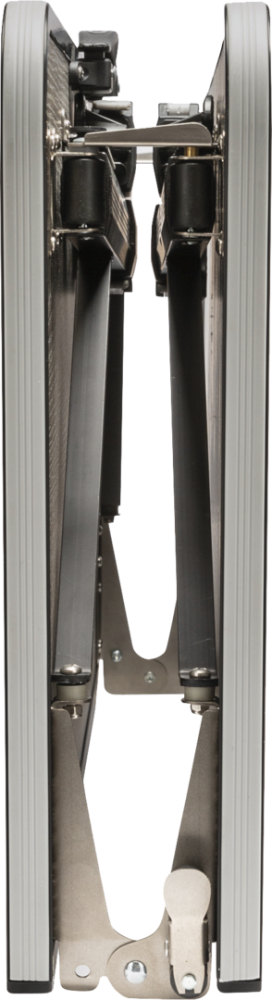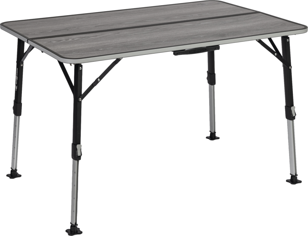 Velmi stabilní, ultralehký stůl s centrálně sklopnou deskou stolu a funkčním hliníkovým rámem. Díky speciálnímu designu lze výškově nastavitelnou a prostorově úspornou desku stolu sklopit ke spodní straně stolu a také zvětšit prostor pro nohy na všech čtyřech stranách. S rukojetí pro přenášení.
