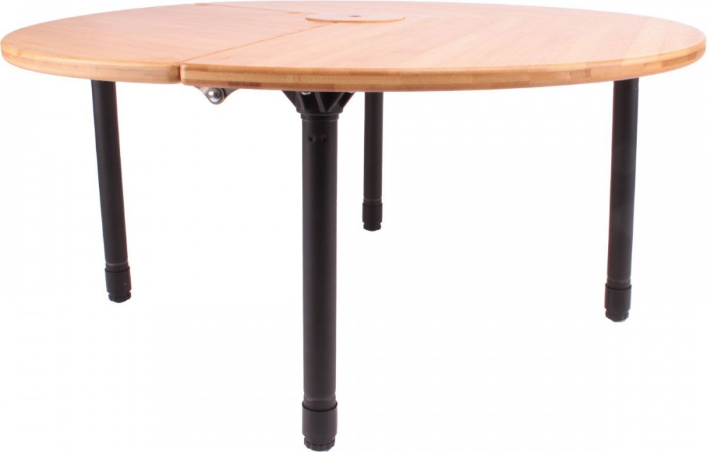 Tento kulatý stůl vyrobený z bambusu a hliníku má desku, kterou lze složit na tři části. Snadno se nastavuje, demontuje a přepravuje. Matně černý rám lze nastavit do dvou výšek díky prodlužovacím nohám. Stůl se dodává v praktické úložné tašce.
