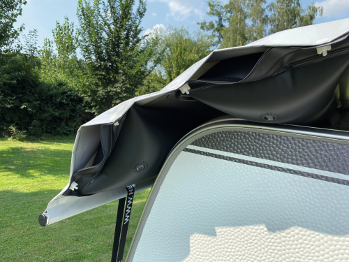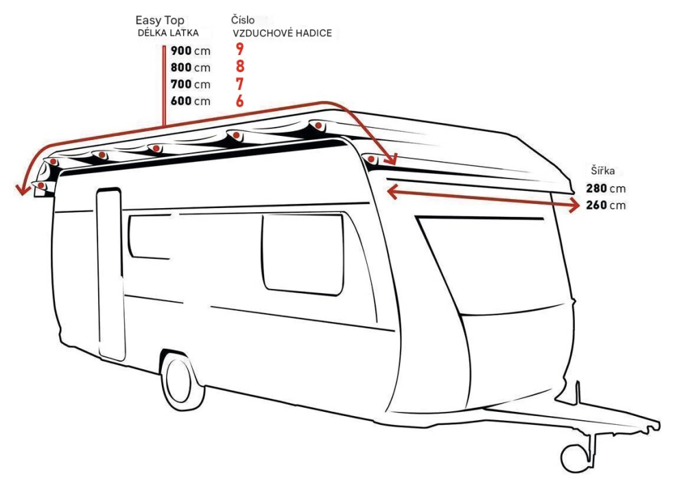 • Rozměry: Rozměry plachty (š x d) jsou přesně specifikovány, abyste si mohli být jisti výběrem správného formátu pro váš karavan. Vyberte si ze šesti různých velikostí, od 260 x 600 cm do 280 x 800 cm.