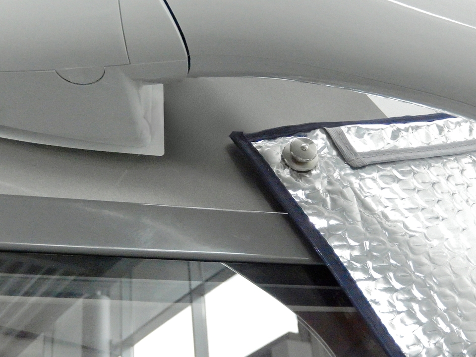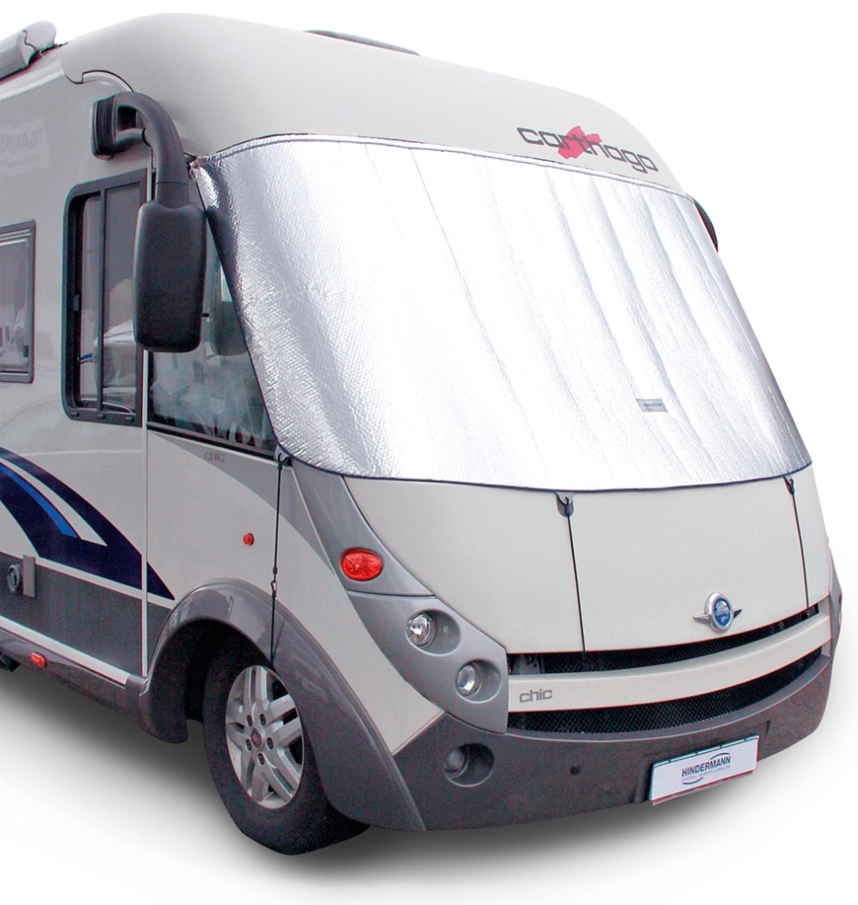 Univerzální izolace čelního skla pro integrované obytné vozy. Termofolie s okrajem po celém obvodu na čelní sklo, přední část nelze otevřít. Vnitřní pryžový napínač podél horního okraje zajišťuje těsné utěsnění a umožňuje rychlé připevnění. Podél spodního okraje jsou čtyři poutka s plastovými očky. Obsahuje gumový napínák. Existuje také možnost připevnění pryžových napínačů pomocí sady patentek LOXX (nutno dokoupit samostatně: KH-90-258 2ks, KH-19-181 5ks). Materiál: Vrchní materiál 100% polyester, spodní materiál 100% polyuretan.