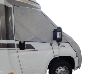 Přední ochranná plachta. Pro obytné vozy, vyrobeno z TYVEK® SUPRA. Chrání vozidlo před námrazou a sněhem, stejně jako interiér před slunečním zářením a topením. To snižuje vnitřní teplotu v létě. U této nové verze jsou chráněna i boční okna a je zabráněno nežádoucím pohledům do vozidla. Přední ochranná plachta chrání lak vozidla před vyblednutím a znečištěním, jako je ptačí trus. Snadno se připevňuje a jednoduše se zahákne do hran dveří a napne. Součástí dodávky je 10 gumových svorek (bez šroubování a vrtání). TYVEK® SUPRA (42% polyetylen, 58% polypropylen) je obzvláště stabilní a zůstává flexibilní i v chladu.