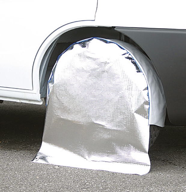 Reflexní kryt kola. Pro auta, karavany a obytné vozy. Kryt má reflexní přední plochu, aby nedošlo k poškození pneumatik UV zářením a chrání před působením tepla. Napomáhá tedy pomalejšímu stárnutí pneumatik. Dobře padne díky trojrozměrnému zpracování. Kryt leží na kole a nemůže sklouznout dolů. Integrovaná výztuha zajišťuje dobré přilnutí a tvarování. Integrovaná očka na kolíky slouží k bezpečnému uchycení.