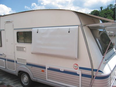 Tepelné rohože. Vyrobeno z 4 mm silné PVC látkové plachty. Upevňuje se nahoře pomocí textilního kedru a dole pomocí výztuhy na očka. Tepelné rohože lze jednoduše srolovat jako okenní klapky. Hodnota prostupu tepla odpovídá hodnotě překližkového panelu o tloušťce 40 mm.