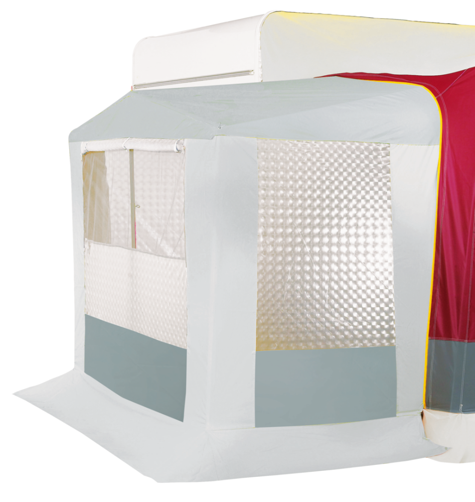 Střešní PVC potažené oboustranně, dělicí závěsy s velkou moskytiérou.