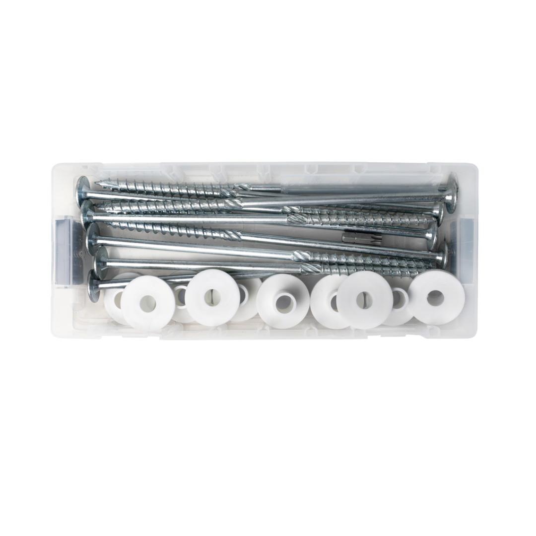 • Rozsah dodávky: 1x sada s 10x stanovými šrouby 8 x 220 mm, 10x bílými plastovými podložkami Ø 35 mm, 1x bitem TX40, 21dílná sada v L-BOXX Micro.