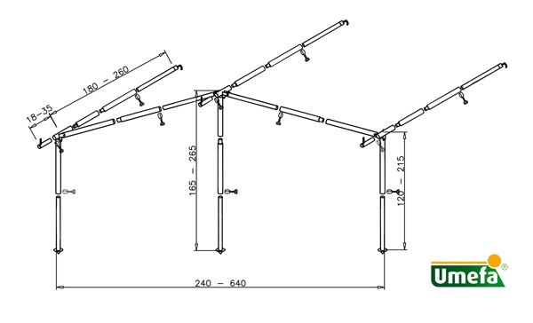 Kompletní konstrukce BUNGALOW hliníková ø 28/25 mm. Šířka od 240 do 640 cm, hloubka max. 260 cm. Vhodné pro obvodové rozměry od 640 do 1150 cm. Obsahuje 3 střešní tyče. Hmotnost cca 9,2 kg.