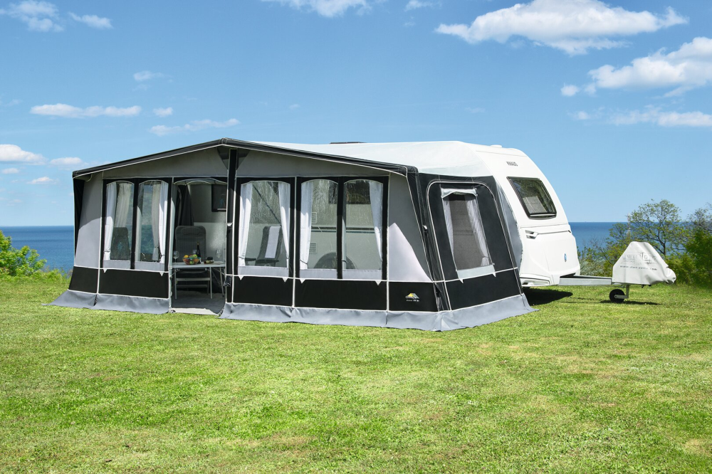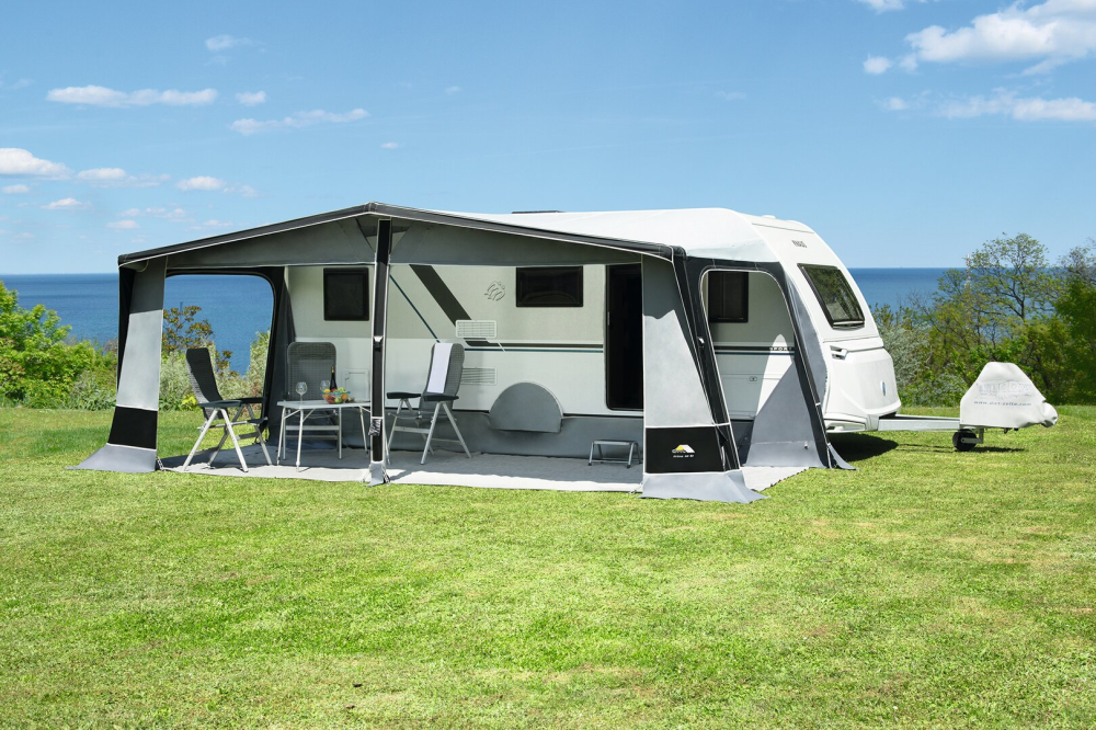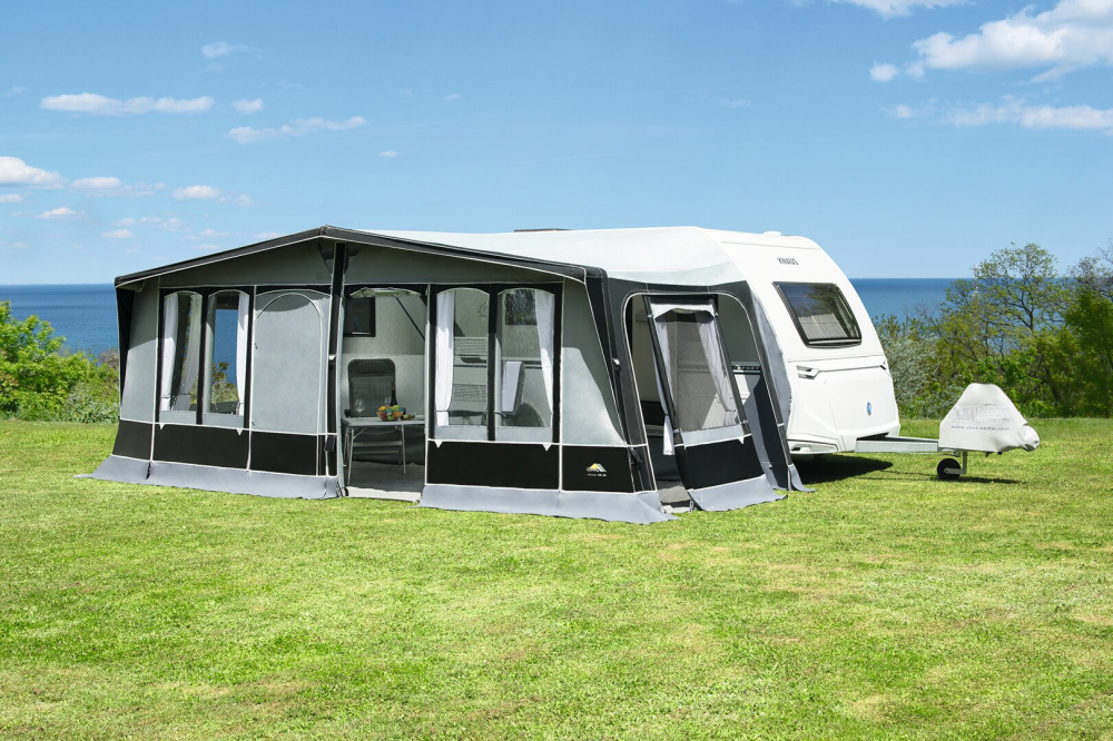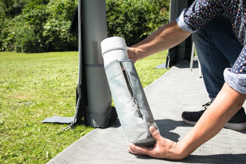• Rozsah dodávky: Plášť stanu se systémem Air-In, závěsy na přední a boční stěny, kolový a větrný štít, bloky pro vyrovnání výšky, kotevní lana včetně 3 napínacích popruhů, vzduchová pumpa a tašky na přenášení.