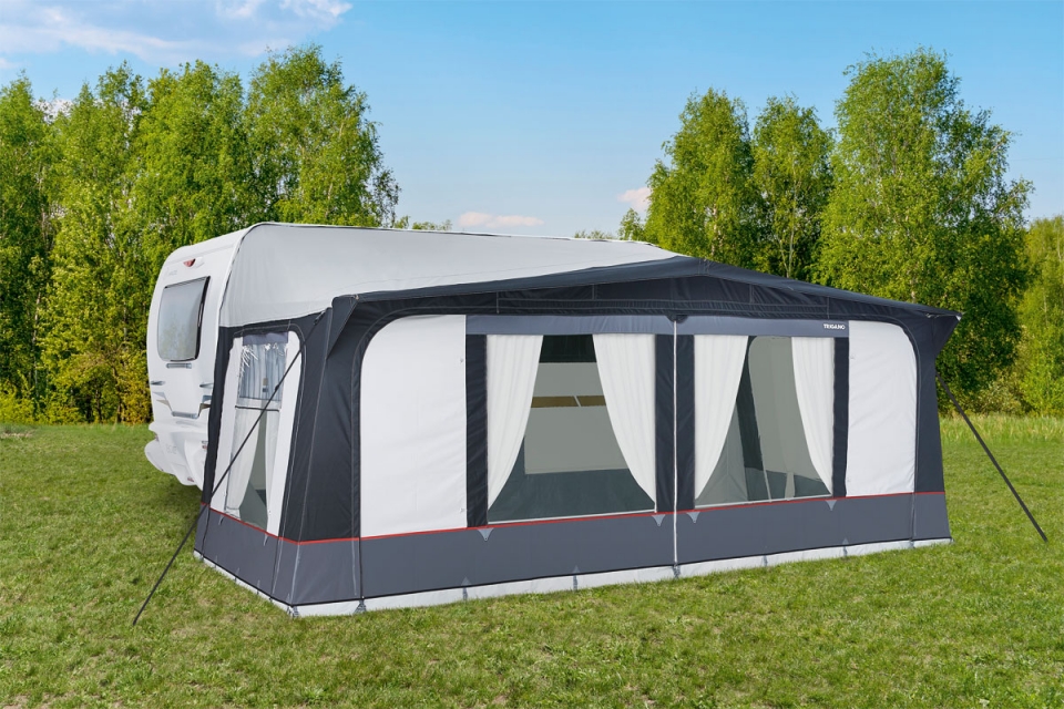 Objevte předstan GOA, cestovní předstan navržen pro sezónní použití, který splní všechna vaše očekávání. Díky odnímatelným a přemístitelným bočním panelům je extrémně modulární. Přední část, kterou lze rozdělit na 2 části, má velký otvor. Také hloubka 270 cm je rozhodující výhodou. Tkanina TRIGATEX 220 výrazně snižuje výskyt kondenzace. V obývacím pokoji je příjemně za každého počasí, a to díky dokonalé cirkulaci vzduchu, kterou zaručují dva zakrývatelné vysoké průduchy pod přesahem střechy. Tento předstan se snadno instaluje, protože tyče jsou vzájemně spojeny.