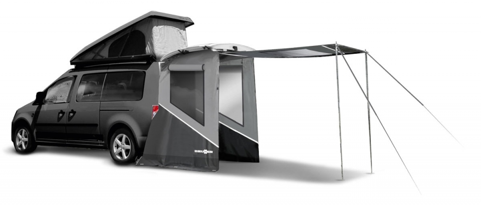 Nově vyvinutý bezrámový stan na zadní výklopné dveře pro připevnění na zadní výklopné dveře nového VW Caddy 5. S tímto velmi dobře vybaveným stanem se interiér Caddy rozšiřuje o pohodlný jídelní a úložný prostor. Stan je připevněn k zadním dveřím vozidla pomocí pevných popruhů. Bočnice jsou na vozidle upevněny proti dešti. Ve spodní části je stan ukotven těsně u vagónu. Vnější lapač nečistot umožňuje odtok velkého množství vody. Přední stěnu lze srolovat nebo postavit jako sluneční střechu. Dvě velká gázová okna na pravé straně stanu a v přední stěně umožňují velmi dobré proudění vzduchu. Napínací pásy a četná kotevní lana dodávají stanu vysokou úroveň stability. Vlastnosti: Bezrámový stan s vysokou odolností proti větru, stabilní popruhy pro uchycení na zadní výklopné dveře, boční stěny lze připevnit k vozidlu, přední stěnu lze zcela srolovat, s velkým gázovým oknem (uzavíratelné tónovanou fólií, zatemnění zevnitř), přední stěnu lze použít jako střešní okno, 2 tyče v ceně, boční stěna vpravo s velkým gázovým oknem, boční stěna vlevo s tónovaným oknem, zatemnění zevnitř, vnější zástěrka s oky, kotvení výměnnými žebříky, 30 cm plastové kolíčky včetně balící tašky. Materiál: 150D Oxford Polyester (100% Polyester). Výška připojení: 170 cm Rozměry: 135 x 135 x V170/200 cm Rozměr balení: 50 x ø 12 cm Hmotnost: 2,5 kg