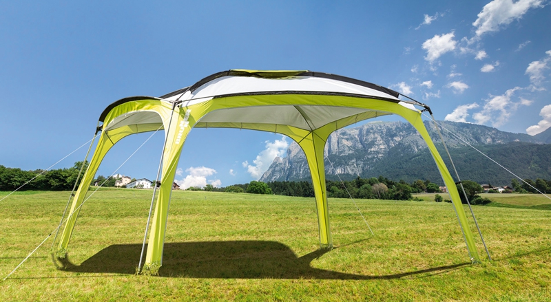 Vysoce kvalitní venkovní altán s vnějšími ocelovými a sklolaminátovými tyčemi. Obsahuje dva odnímatelné boční panely.