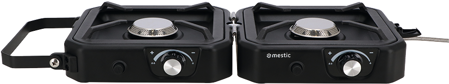 Přenosný 2 plotýnkový sporák. Kompaktní a skládací pro snadné skladování. S elektrickým zapalováním. Obsahuje plynový ventil, hadici, tašku a grilovací desku. Rozměr varné desky 18,5 x 16,5 cm. Pro použití se šroubovacími plynovými kartušemi (norma EN417). Výkon 2 x 1,8 kW.