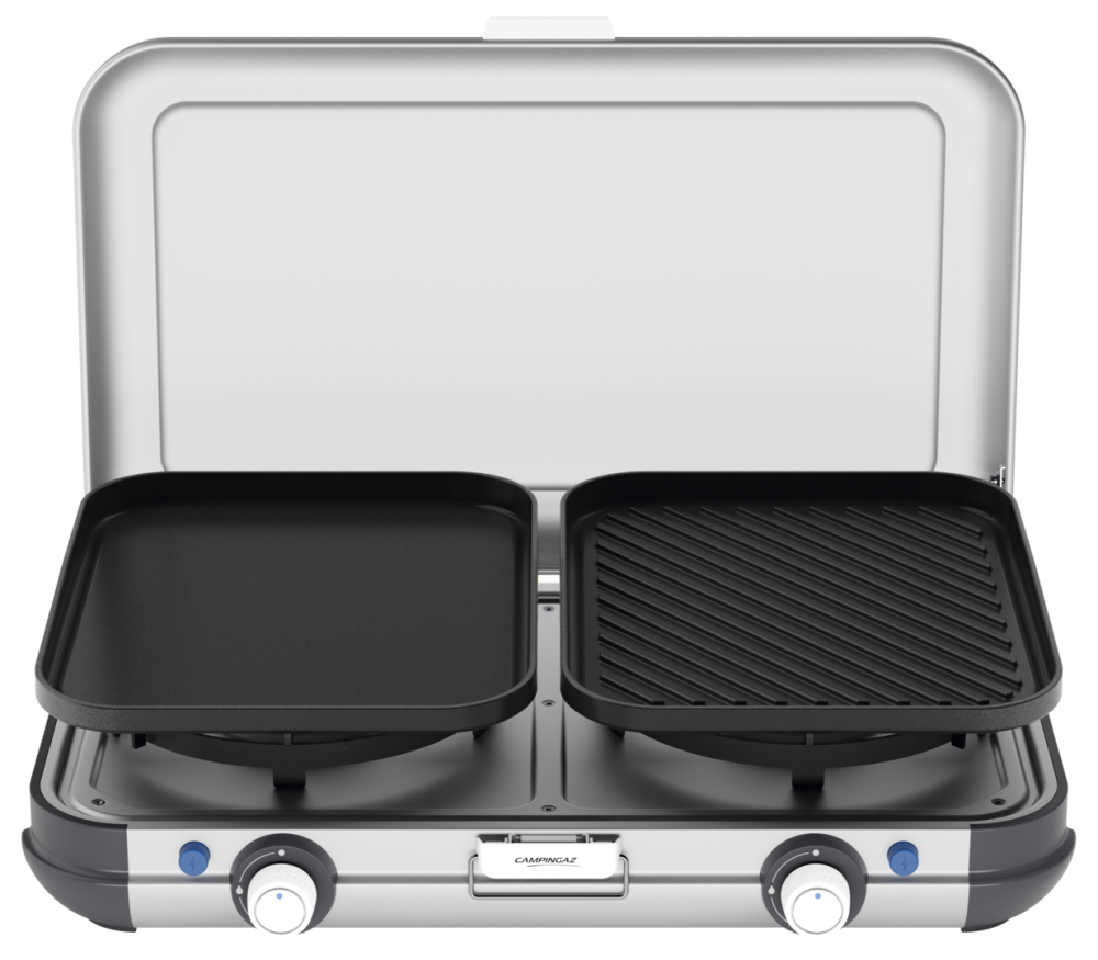Plancha a grilovací deska ze smaltované oceli s nepřilnavým povrchem. Oba hořáky s piezo zapalováním.