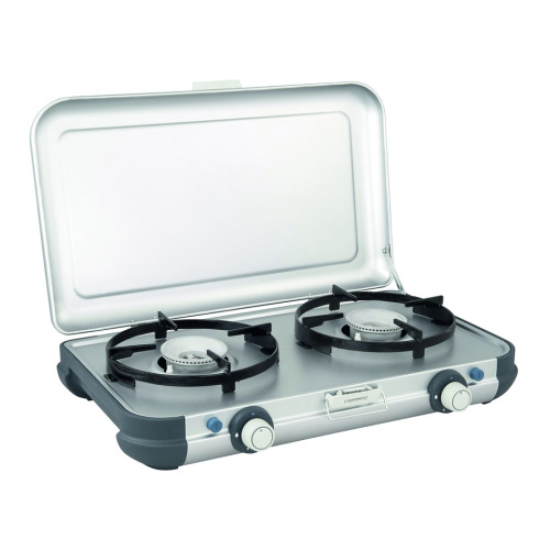 Camping Kitchen 2 je lehký a snadno přenosný dvouplotýnkový vařič, dostupný v kartušové i lahvové verzi v závislosti na délce vaší dovolené. Kompaktní design s vestavěnými držadly pro přenášení umožňuje prostorově úsporné skladování v autě nebo mobilním domě. Dále má vařič žáruvzdorné držáky na hrnce ze smaltované oceli, které zároveň slouží jako větrolam. Držáky hrnců lze snadno vyjmout pro rychlé a snadné čištění.