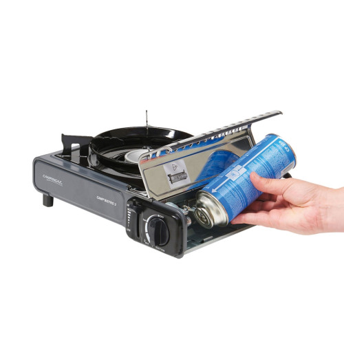 Camp'Bistro™ 3 má kompaktní a lehčí design, stejně jako přepracovanou podpěru pánve, která se používá ještě snadněji a pohodlněji než předchozí model. S přepravním pouzdrem pro snadnou přepravu a bezpečné skladování. Camp´Bistro™ 3 bylo testováno a vyhovuje evropské normě EN17476:2021. S kartušovým systémem "Safety-Lock" a piezo zapalováním. Provoz s kartuší na stlačený plyn č. KH-44-106.