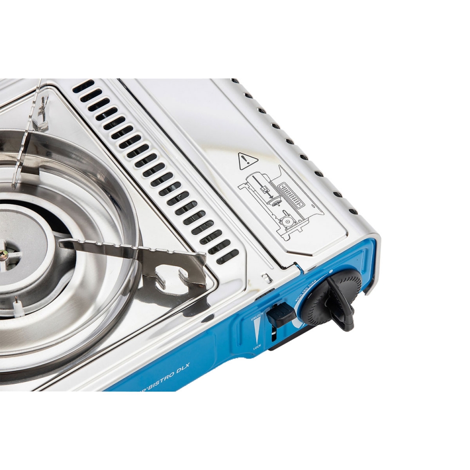 Nové modely DLX renomované série Camp'Bistro mají přepracovanou podpěru pánve, jejíž použití je ještě jednodušší a pohodlnější než u předchozích modelů. Sporák je dodáván v plastovém kufříku pro snadnou přepravu a bezpečné skladování. Snadno se čistící nerezová ocel. S kartušovým systémem "Safety-Lock" a piezo zapalováním. Provoz s kartuší na stlačený plyn č. KH-44-106.
