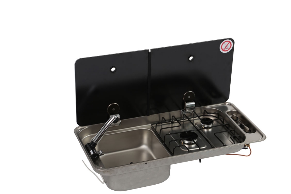 Kombinace 2 plotýnkového sporáku a dřezu s obdélníkovým umyvadlem. S piezo zapalováním. Výkon 2,9 kW (1x 1 kW, 1 x 1,9 kW). Spotřeba plynu 200 g/h (1 x 73 g/h, 1 x 127 g/h). Plynová přípojka 30 mbar. Rozměry (ŠxVxH) 716 x 150 x 340 mm. Instalační rozměry 696 x 325 mm. Hmotnost 5kg.