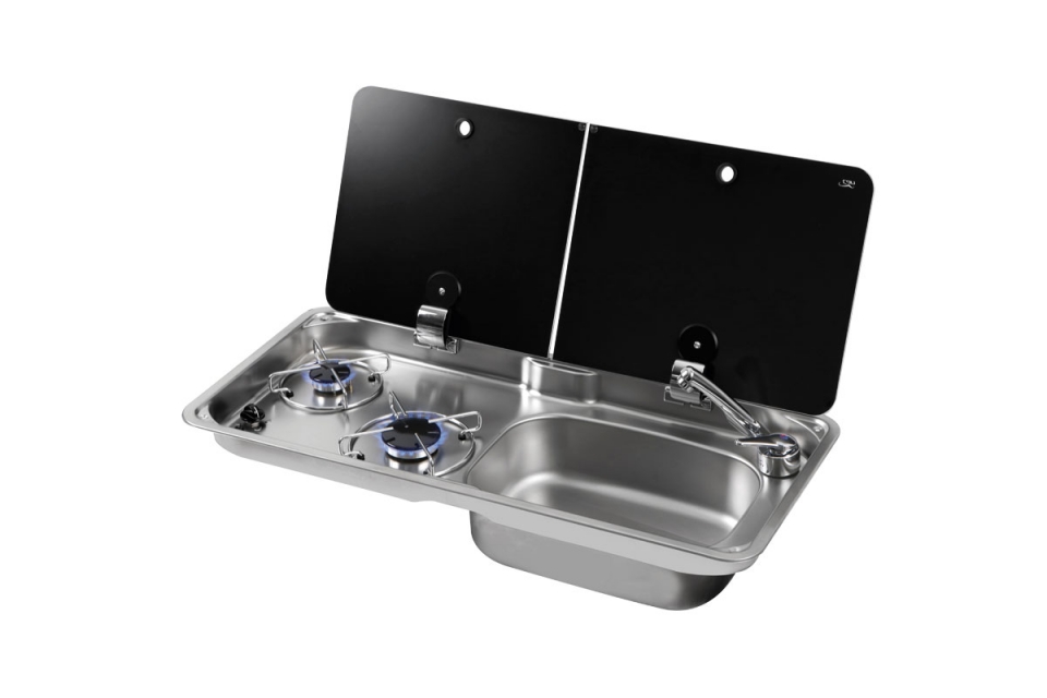 Kombinace 2 plotýnkového sporáku a dřezu s obdélníkovým umyvadlem. S piezo zapalováním. Výkon 2,9 kW (1x 1 kW, 1 x 1,9 kW). Spotřeba plynu 200 g/h (1 x 73 g/h, 1 x 127 g/h). Plynová přípojka 30 mbar. Rozměry (ŠxVxH) 765 x 100+50 x 355 mm. Instalační rozměry 730 x 320 mm. Hmotnost 6kg.