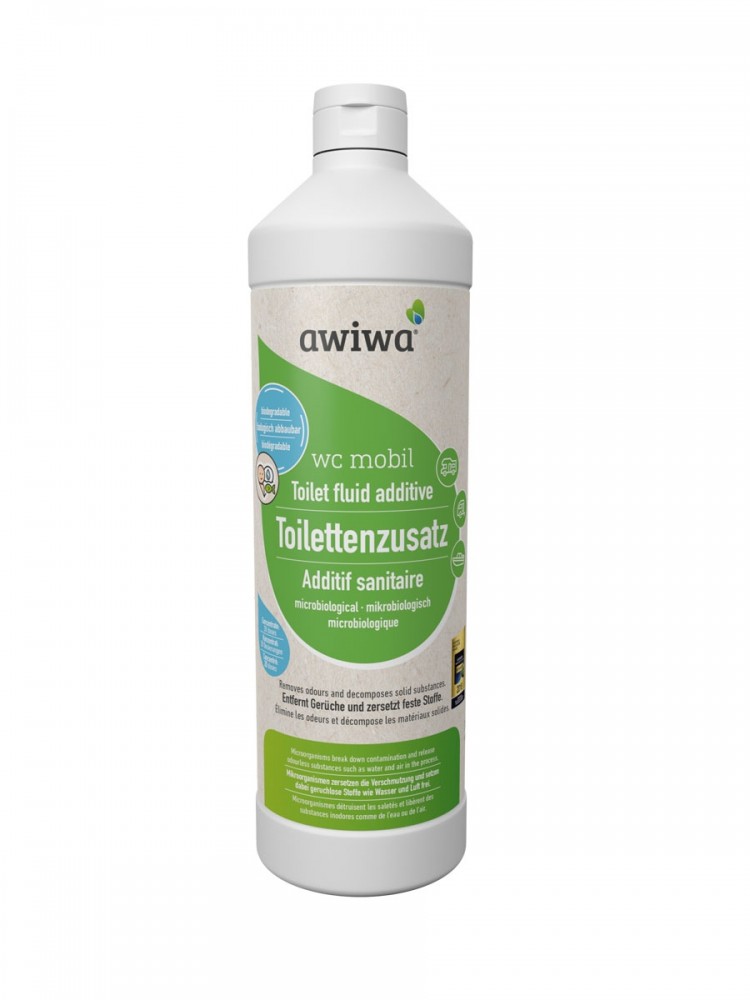 Přísada do toalet awiwa. Mikrobiologická přísada do toalet awiwa s vysoce účinným složením enzymů a přírodních mikroorganismů rozkládá výkaly a papírové ubrousky a zajišťuje tak bezstříkající vyprázdnění nádrže na odpad: žádné hrudky, žádné ucpávání a žádný zápach. Nepříjemné pachy jsou eliminovány, nikoli maskovány. Hygienicky čisté a bez chemikálií pro ekologickou likvidaci. Obsah nádrže lze spláchnout do toalety. Vhodné pro jakoukoli přenosnou toaletu v obytném voze, karavanu nebo lodi. Velmi úsporné: 1 litr vystačí na 20 použití.