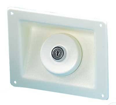 Kryt zámku a 2 klíče. Připojení hadice ø40 mm, rozměry (VxŠxH) 137 x 158 x 80 mm. Výřez 120 x 102 mm. Barva bílá.