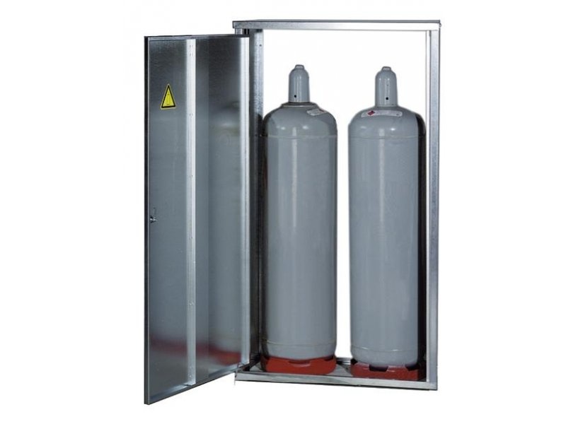 Ochranná skříňka na láhev. K ochraně plynových lahví před neoprávněným přístupem. Vyrobeno z žárově pozinkované oceli. Se zadním panelem a čtvercovým zámkem včetně čtvercového klíče. Při použití 33 kg plynových lahví dle nařízení v kempech.