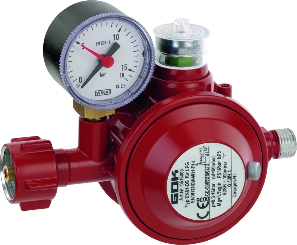 Pro připojení k plynovým lahvím, k regulaci tlaku na jmenovitý tlak plynového spotřebiče. Přetlakové bezpečnostní zařízení S2SR (ÜDS) k ochraně spotřebitelských zařízení před nepřípustně vysokým tlakem. Vizuální zobrazení (zelená/červená) s optickým signálem (červená) při výstupním tlaku nad 80 mbar. Tepelný uzávěr „T“ (TAE) pro automatické uzavření průtoku plynu, když teplota překročí +100 °C. S manometrem pro kontrolu těsnosti.