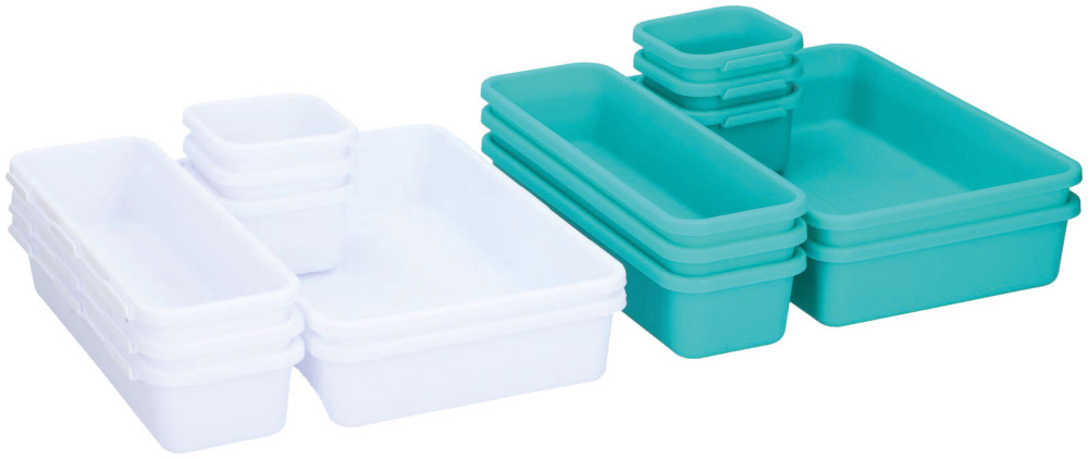 8dílná sada skládající se ze 2 přihrádek 15,5 x 23,5 x 4,5 cm, 3 přihrádek 7,5 x 23,5 x 4,5 cm a 3 přihrádek 7,5 x 7,5 x 4,5 cm. S klik systémem.