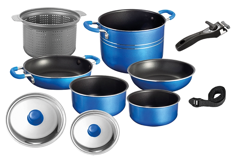 Sada obsahuje: 1 hrnec ø 22 cm - 5 l, 1 síto ø 22 cm, 1 pánev ø 22 cm - 1,8l, 1 hrnec ø 18 cm - 2l, 1 hrnec ø 16 cm - 1,5l, 1 pánev ø 20 cm - 1,7l, 1 víko ø 22 cm, 1 víko ø 18 cm, 1 rukojeť, 1 popruh