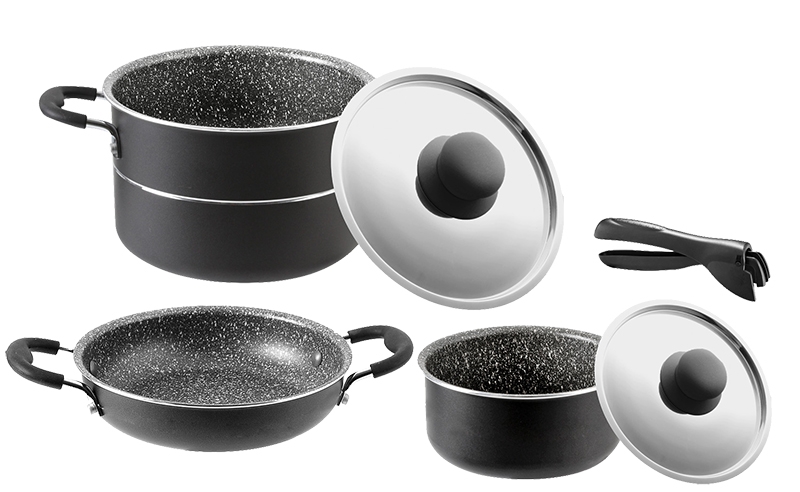 7dílná sada skládající se z: 1 hrnce ø 18 cm, 1 hrnce ø 16 cm, 1 pánev ø 18 cm, 1 poklice ø 18 cm, 1 poklice ø 16 cm, 1 rukojeť a 1 popruh.