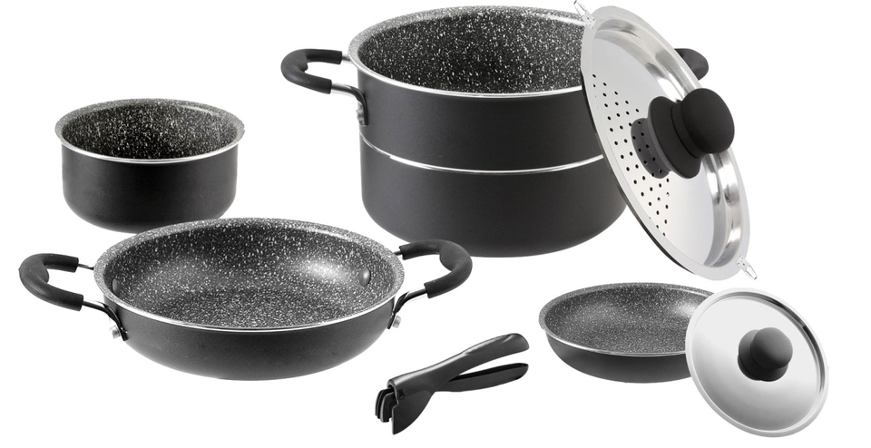 8dílná sada skládající se z: 1 hrnce ø 20 cm, 1 víka síta ø 20 cm, 1 hrnec ø 16 cm, 1 pánev ø 20 cm, 1 pánev ø 18 cm, 1 víko ø 18 cm, 1 rukojeť a 1 popruh.