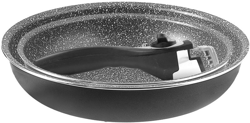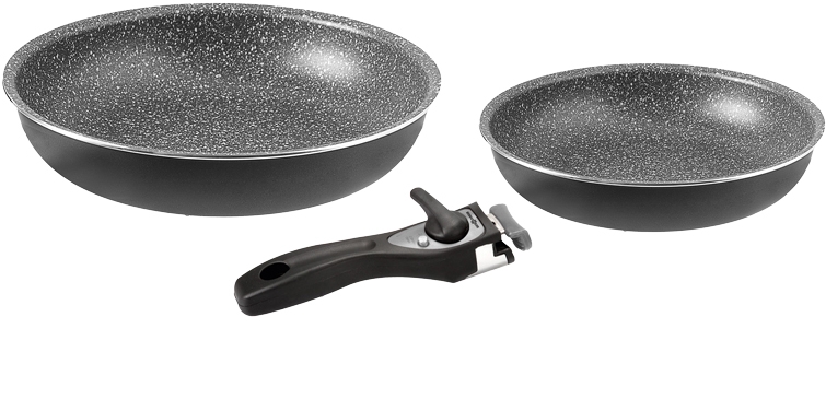 3dílná sada skládající se z 1 pánve ø 28 cm, 1 pánve ø 22 cm a 1 rukojeti.