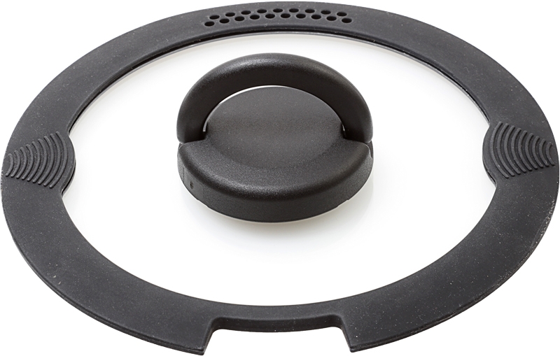 Skleněná poklice COVERY. Skleněná poklice se silikonovým protihlukovým okrajem s otvorem na síto a štěrbinou pro uchycení rukojeti.