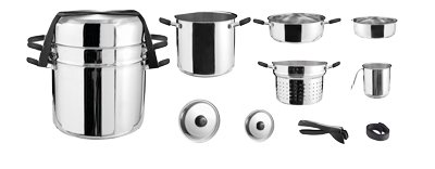 Vysoce kvalitní sada hrnců s úsporou místa. Hrnce a poklice jsou vyrobeny z vysoce kvalitní, zrcadlově leštěné nerezové oceli. Vhodné pro plynové, elektrické, sklokeramické a indukční sporáky. Vhodné do myčky.