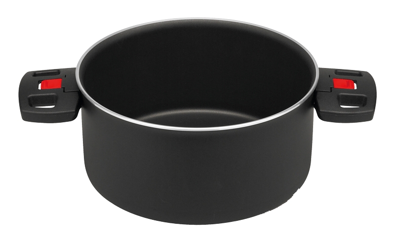 Ballarini Click & Cook. Revoluční řešení, které šetří místo v kuchyni! Skládací rukojeti, vkládací nádobí. Nová produktová řada Click & Cook od Ballarini je všestranná a prostorově úsporná. Plastová madla lze složit a rozložit jednoduchým pohybem, takže vždy máte místo v kuchyňské skříni, v lednici nebo v myčce na nádobí. Vzhledem k tomu, že hrnce jsou stohovatelné, budete potřebovat pouze úložný prostor o výšce 12 cm. Patentovaná aretace rukojetí umožňuje nejbezpečnější manipulaci při vaření. Vnitřní vrstva: 3-násobně keramický vyztužený nepřilnavý povrch KERAVIS. Vnější povrch: práškový lak.