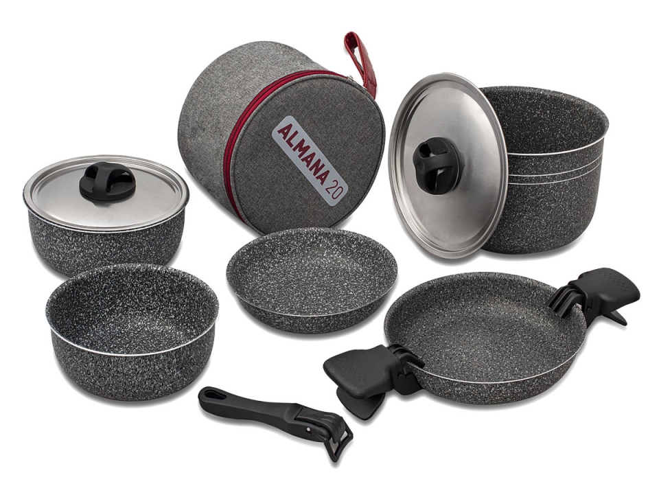 Nádobí vyrobené z 99,5 % hliníku, bezpečné pro styk s potravinami a s nepřilnavým povrchem. Sada skládající se z 1 hrnce ø 20 cm, 1 hrnce ø 18 cm, 1 hrnce ø 16 cm, 1 pánve ø 20 cm, 1 pánve ø 18 cm, 1 pokličky ø 20 cm, 1 poklice ø 18 cm, 2 rukojetí hrnce, 1 rukojeti a 1 tašky. Vhodné pro tři osoby. Hmotnost 1,65 kg.