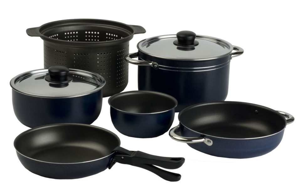 Nádobí vyrobené z 99,5 % hliníku, bezpečné pro potraviny a s nepřilnavým povrchem. 9dílná sada skládající se z 1 hrnce ø 22 cm, 1 hrnce ø 20 cm, 1 hrnce ø 16 cm, 1 pánve ø 22 cm, 1 pánve ø 20 cm, 1 poklice ø 22 cm, 1 poklice ø 20 cm, 1 hliníku síto a 1 rukojeť tyče. Vhodné pro pět osob. Hmotnost 2,25 kg.