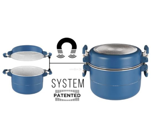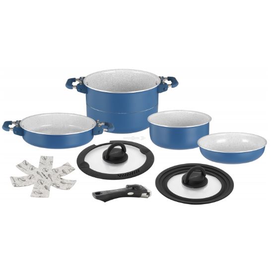 CAREZZA MAGNETOGRIP 7+1 ø 24. 8dílná sada skládající se z: 1 hrnce ø 24 cm - 4,1 l, 1 hrnce ø 20 cm - 2,3 l, 1 pánev ø 24 cm - 1,4 l, 1 pánev ø 22 cm - 1,4 l, 1 víko ø 24 cm, víko ø 24/22/20 cm, 1 kleště na rukojeť, 1 chránič hrnce a pánve.
