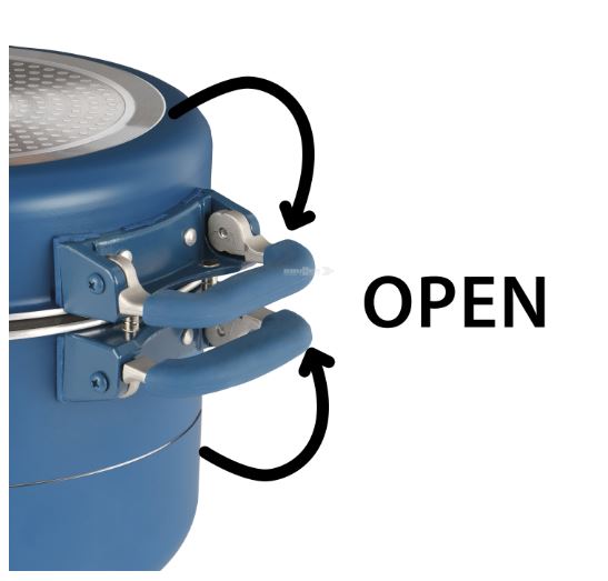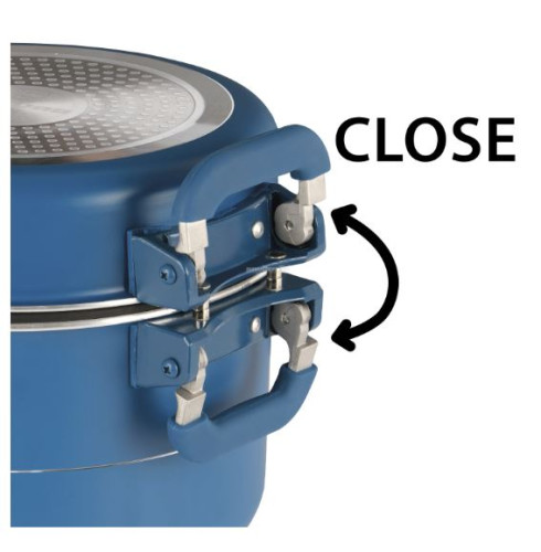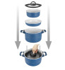 Sada hrnců CAREZZA MAGNETOGRIP. Nově vyvinutá rukojeť a spojovací systém. Použití sklopných rukojetí s integrovaným magnetickým prvkem má za následek výrazné snížení velikosti balení sad hrnců a také použití upínacího popruhu pro stabilizaci