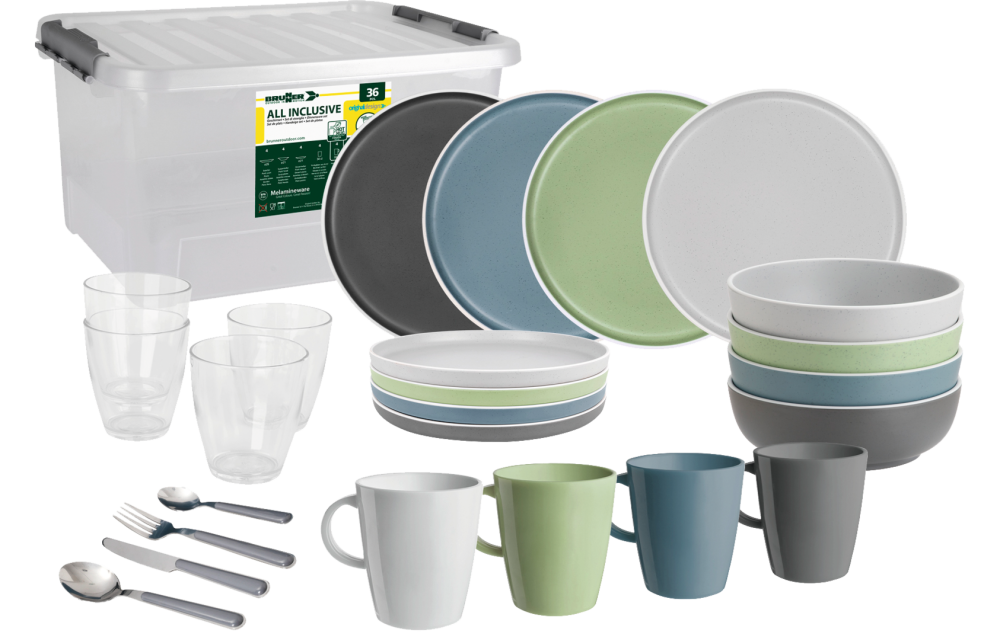 36dílná sada skládající se ze 4 jídelních talířů ø 25 cm, 4 dezertních talířů ø 20 cm, 4 polévkových talířů ø 20 cm, 4 hrnků 30 cl, 4 sklenic 20 cl a 16dílné sady příborů.