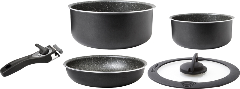 6dílná sada skládající se z: 1 hrnec ø 20 cm, 1 hrnec ø 18 cm, 1 pánev ø 20 cm, 1 poklička ø 20 cm, 1 rukojeť a 1 úložný vak.